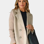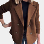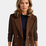 Diseñado con un frente estructurado de doble botonadura y mangas de punto suaves, te brinda libertad de movimiento sin sacrificar la elegancia. La tela de peso medio proporciona una calidez sutil – perfecta para días frescos cuando quieres verte impecable sin sentirte restringida.