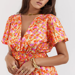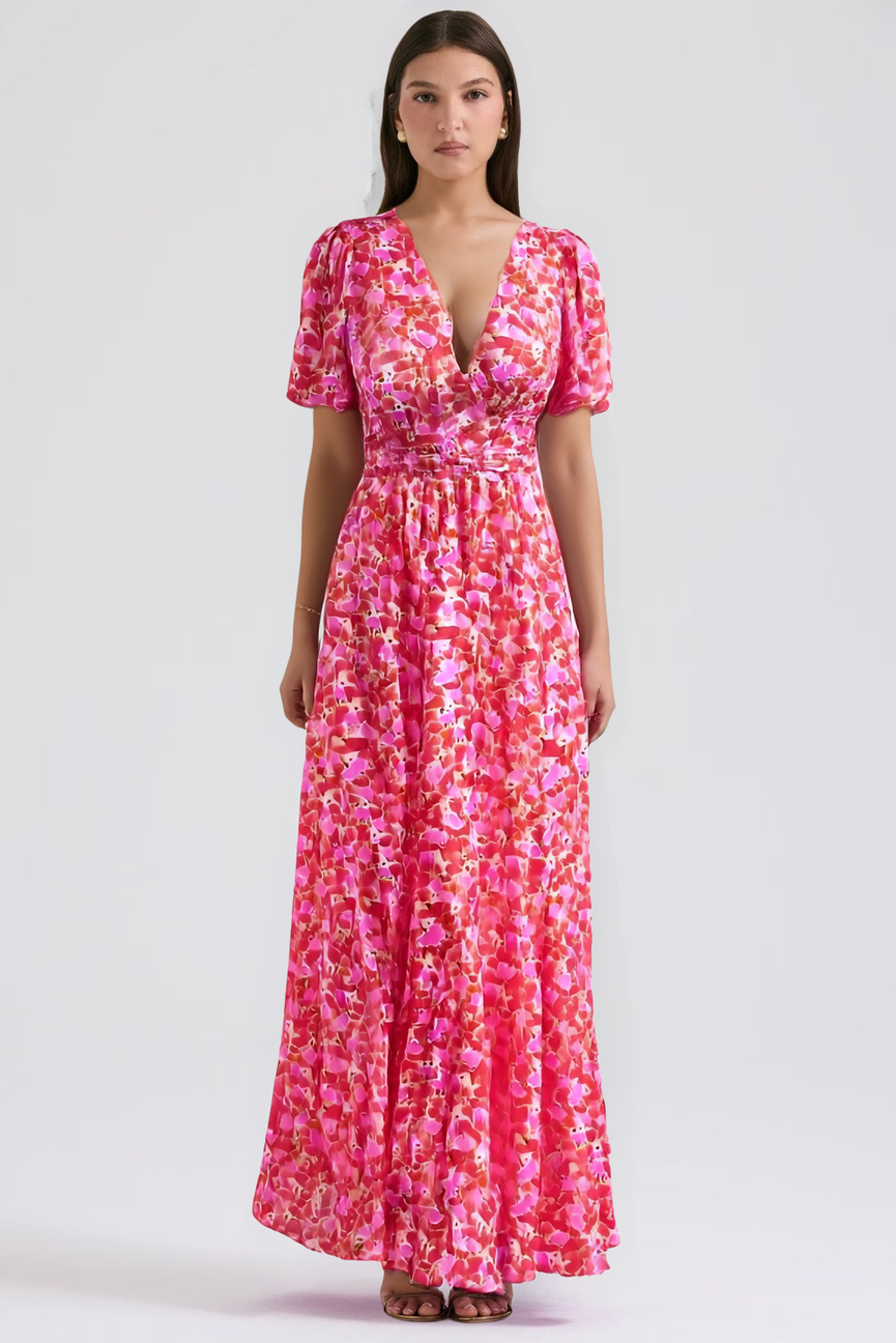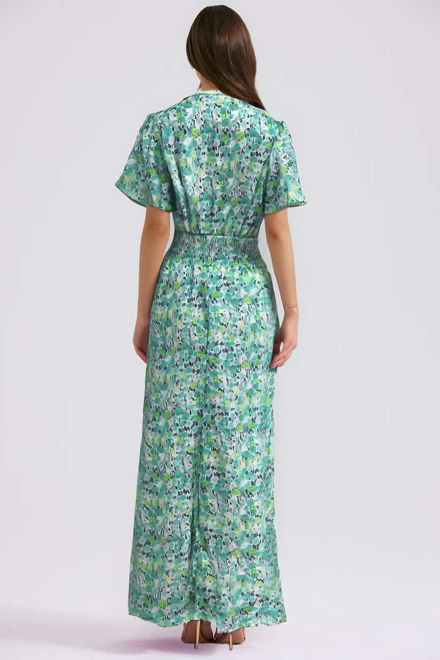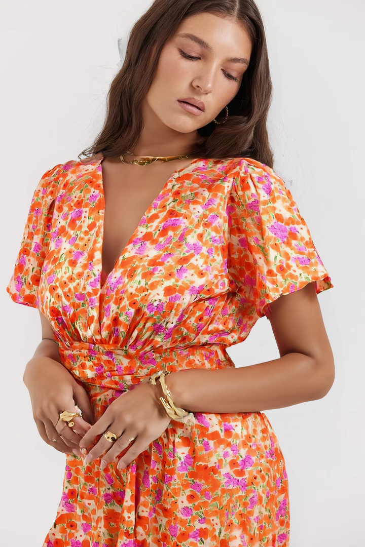 Su estampado floral vibrante evoca la frescura de los días soleados, mientras que su corte favorecedor realza la silueta con naturalidad y elegancia.