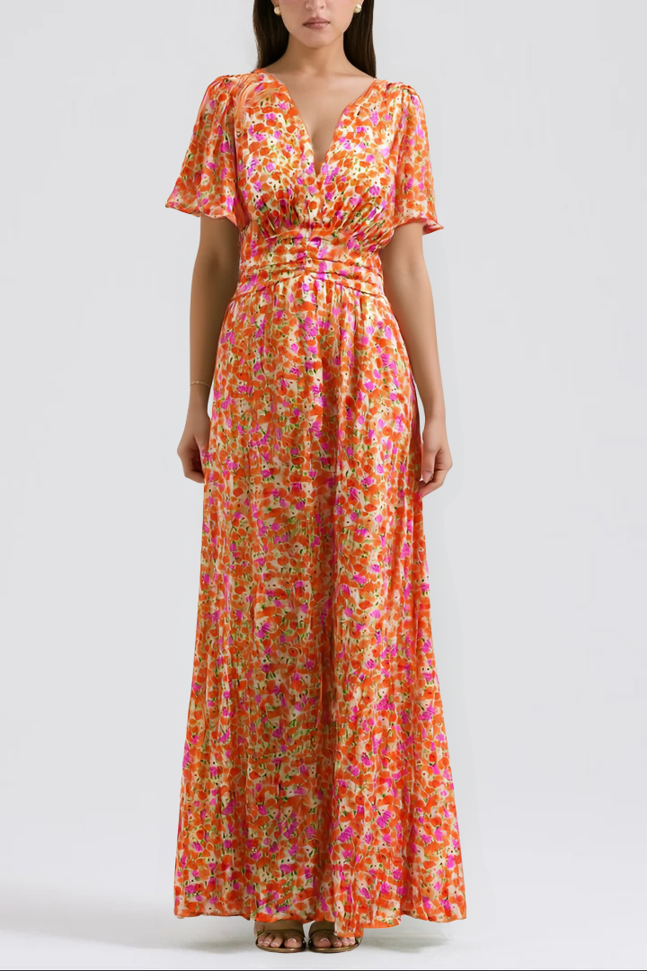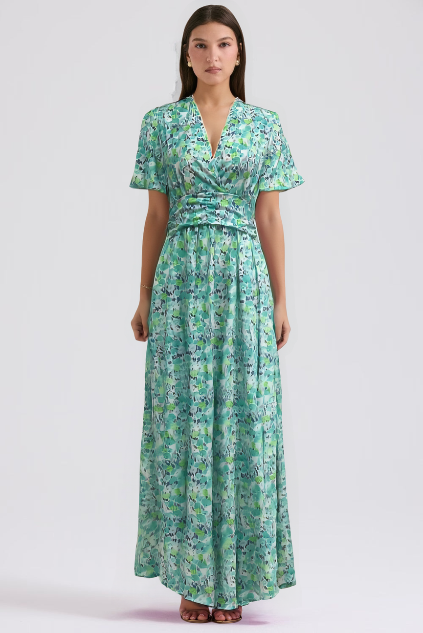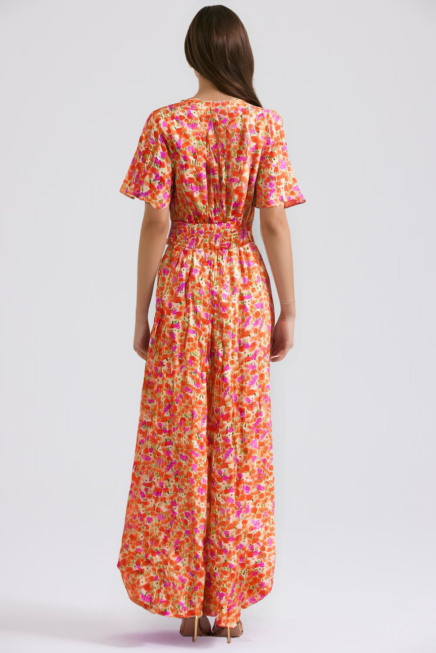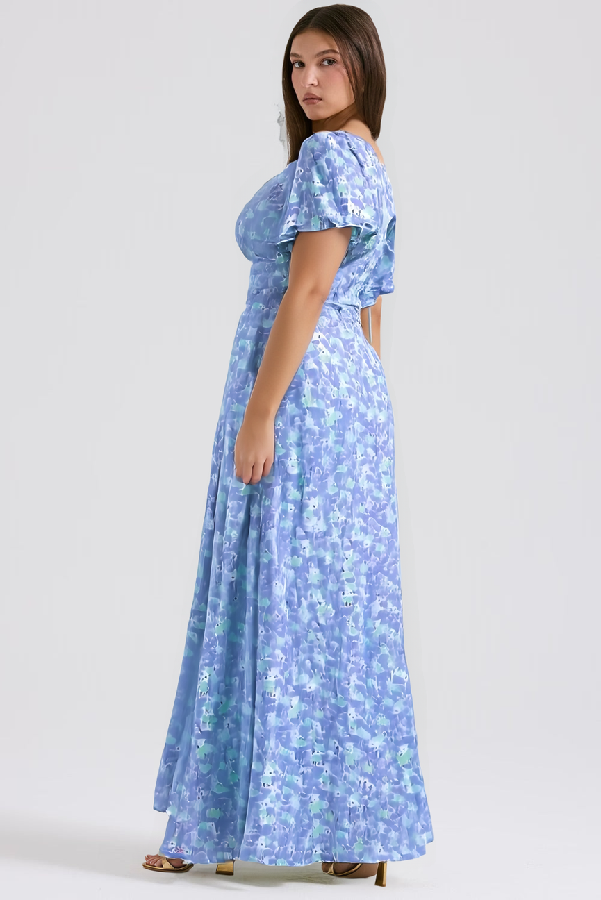 Su estampado floral vibrante evoca la frescura de los días soleados, mientras que su corte favorecedor realza la silueta con naturalidad y elegancia.