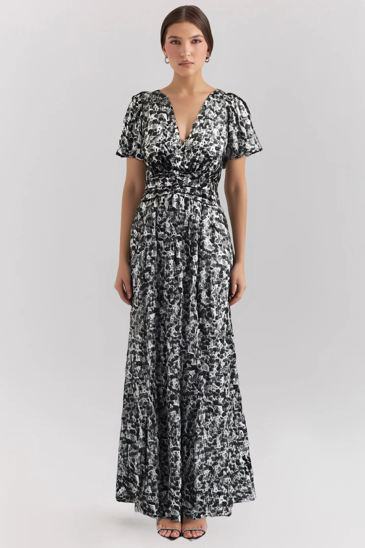 - Escote en V y cintura bajo el pecho para estilizar la figura y aportar un aire refinado.