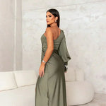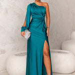 Haz una entrada inolvidable con el vestido Melyssa, un vestido de noche de un solo hombro que encarna la sofisticación sin esfuerzo. Confeccionado en un tejido fluido de acabado brillante, se adapta perfectamente al cuerpo creando una silueta suave y alargada. La manga fluida y los suaves pliegues se mueven con gracia a cada paso, mientras que la sutil abertura lateral añade el toque justo de atractivo.