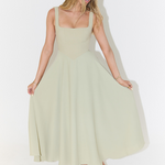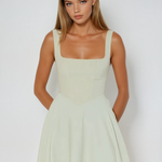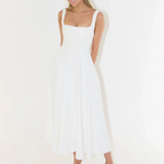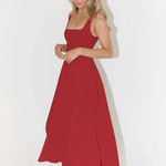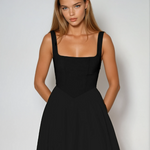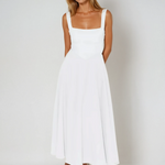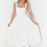 Serafina™ er kjolen, der forener klassisk elegance med en romantisk silhuet – perfekt til sommerbryllupper, havefester eller en særlig aften i byen. Den tætsiddende overdel fremhæver taljen, mens den svajende midinederdel skaber lethed og bevægelse. Brede stropper og et firkantet halsudskæring tilfører et stilrent, moderne udtryk inspireret af skandinavisk æstetik.