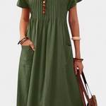 Chic y fácil de llevar, el Vestido Lottie combina comodidad fresca con una silueta favorecedora. Con su corte de longitud media, suaves mangas cortas y bolsillos discretos, está diseñado para moverse contigo—perfecto para la comodidad diaria o la elegancia casual.