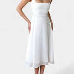 Deslízate con elegancia sin esfuerzo con el Vestido Mary, una silueta A-line sin mangas atemporal diseñada con una forma favorecedora de ajuste y vuelo. Con un escote cuadrado, tirantes anchos y una falda midi suavemente acampanada, es perfecto para todo, desde brunchs informales hasta celebraciones al sol.