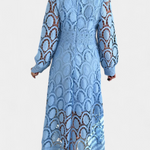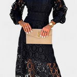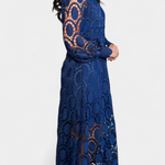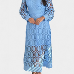 Pulido y refinado, el Vestido Jovie captura la feminidad atemporal con intrincado encaje y una silueta fluida. Con un cuello alto, mangas largas transparentes y bordados detallados, es la elección perfecta para fiestas en el jardín, bodas y ocasiones primaverales.