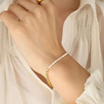 Suavidad y fuerza en equilibrio — la pulsera Amélie Pearl está hecha para la romántica moderna. Una cadena dorada audaz se entrelaza con perlas naturales, creando una pieza que celebra el contraste, la armonía y la belleza sin esfuerzo.