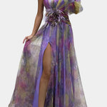 Una declaración de estilo para eventos que exigen presencia. El vestido Amelie combina un diseño escultural con detalles etéreos, desde su escote asimétrico hasta la falda drapeada con abertura frontal. El estampado acuarelado y el aplique floral en la cintura elevan su elegancia, creando una silueta inolvidable para celebraciones sofisticadas.